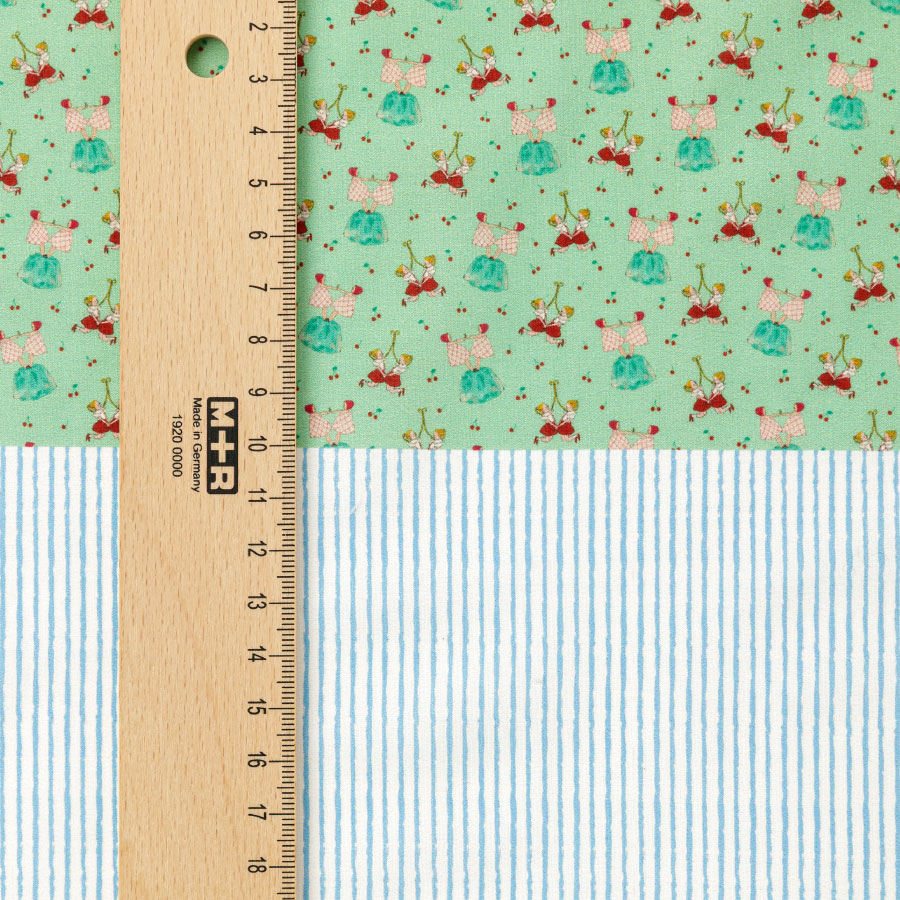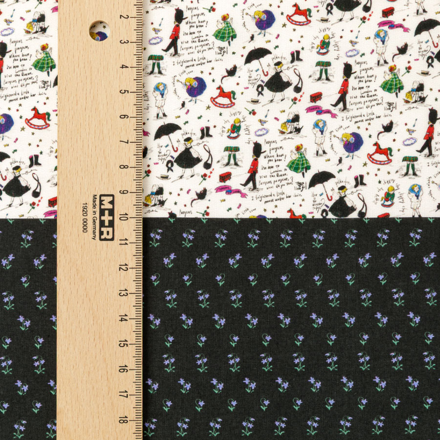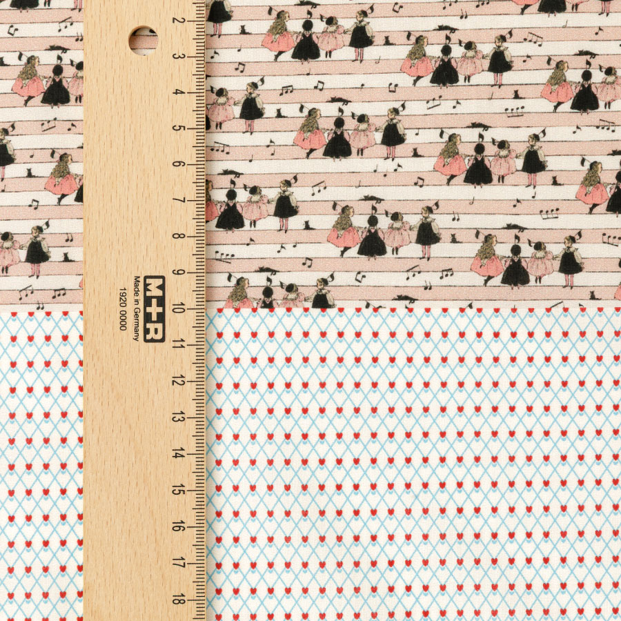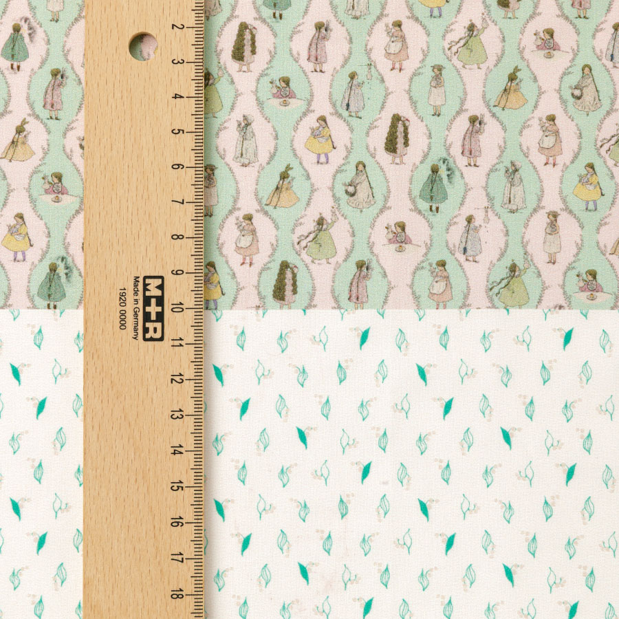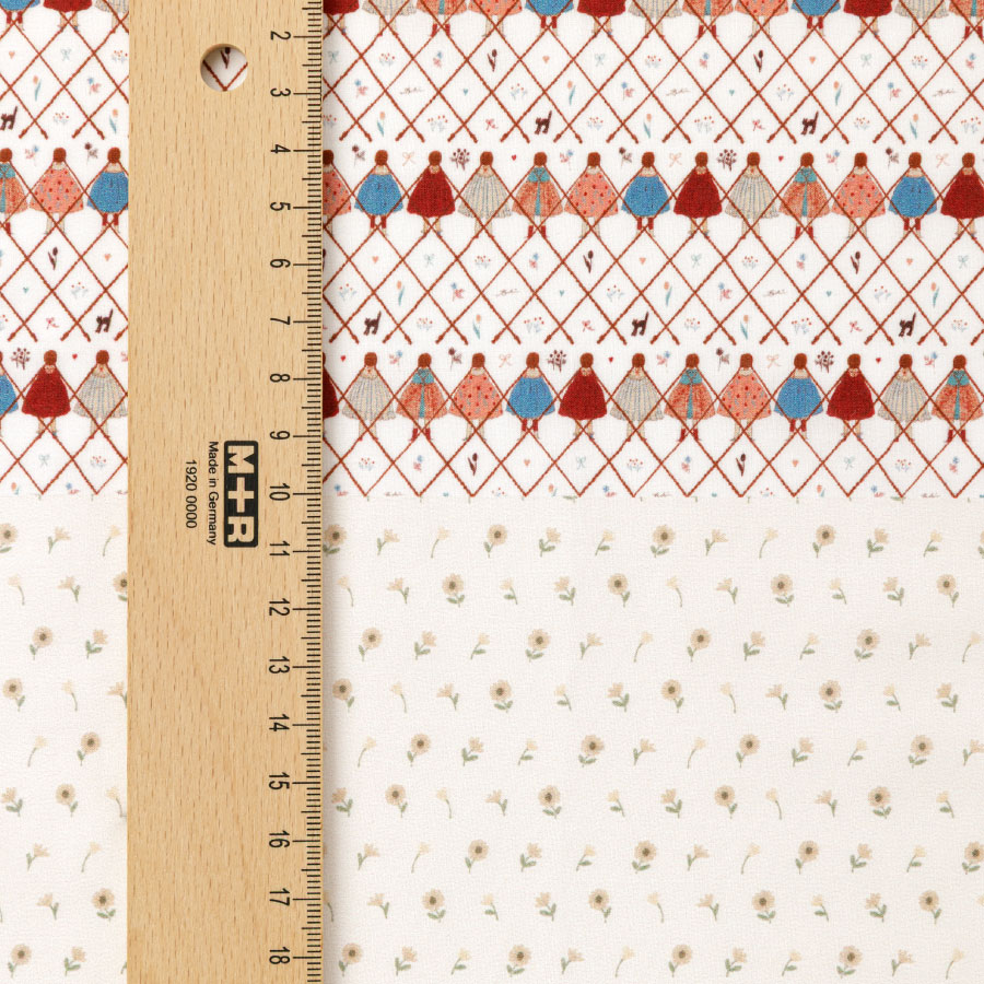 この生地は、幅約34cm、長さ50cmのサイズに、通常サイズの生地柄をミニチュアサイズに縮小したデザインと、くらはしれいさんが描くお洋服の柄を忠実に再現したデザインの2種類がプリントされています。どちらもドール服にぴったりで、細部までこだわりが詰まった美しい仕上がりです。