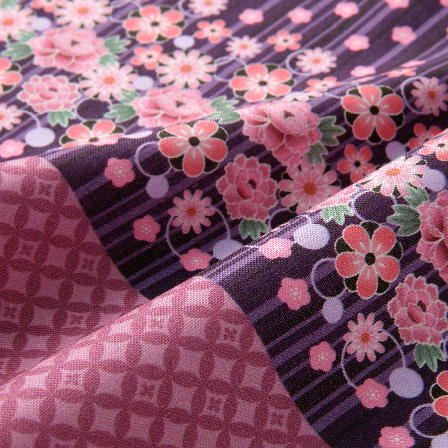 シーチング生地 着物 紫花×七宝